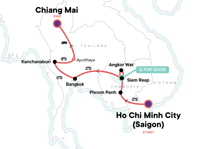 Your Discover Moment: Bangkok. Mekong Delta day trip. Cyclo tour (Phnom Penh). Tuol Sleng prison and Choeung Ek (Killing Fields) entrance and guide. Two-day Angkor Wat complex entry and guide, including sunrise tour. Wat Pho visit. Klong riverboat tour. Erawan Falls and Bridge on the River Kwai visit (Kanchanaburi). Thai-Burma Railway Centre and Allied War Cemetery visit. Temple ruins tour (Ayutthaya). Doi Suthep temple visit (Chiang Mai). All transport between destinations and to/from included activities.