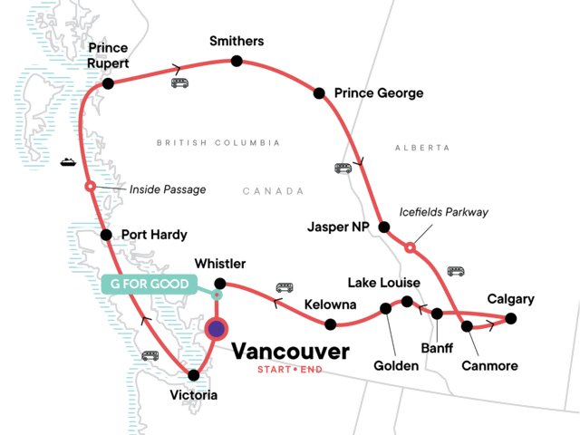 Your Hands-On Moment: Medicine Bag Making Activity, Whistler. Inside Passage cruise. First Nations day tour (Smithers). Mt Robson stop with visit to Interpretation Centre. Icefields Parkway drive. Columbia Icefield stop. Lake Louise visit. Free time in Victoria, Smithers, Jasper National Park, Banff, Whistler, and Vancouver. All transport between destinations and to/from included activities.
