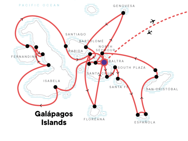 Flights to either of the airports in the Galapagos leave early in the morning on Day 2 and get you into the islands in the early afternoon. Flights back to the mainland depart between 10:00am and 1:30pm arriving in the early evening.