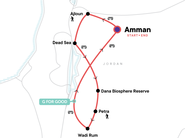 Your Local Living Moment: Bedouin Camp Overnight, Wadi Rum. Petra guided tour. Little Petra visit. Wadi Rum 4x4 excursion. Trekking Ajloun Reserve. Trekking Dana Nature Reserve. Canyoneering. Dead Sea visit. Entrance fees in all included tours. All transport between destinations and to/from included activities.