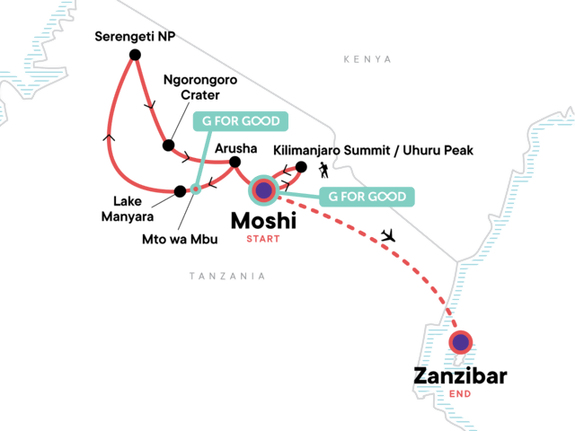Your Welcome Moment: Welcome Moment - Meet Your CEO and Group. 6-day guided group trek up Mt Kilimanjaro's Machame Route with local guides, cooks and porters. All permits and fees. Lake Manyara wildlife safari drive. Serengeti wildlife safari drives. Ngorongoro Crater wildlife safari drive. Scenic flight from Arusha to Zanzibar. Orientation walk in Stone Town. Spice plantation guided tour. All transport between destinations and to/from included activities.