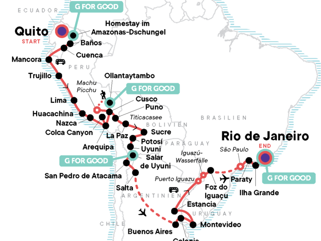 Nights 2-4: Amazon homestay, Nights 8, 11, 13 and 18: overnight buses, Nights 20-21: Colca Canyon, Night 22: overnight bus, Nights 23-24: Cusco, Nights 25-27: Inca Trail, Nights 29-30: Cusco, Night 32: Lake Titicaca homestay, Night 36: overnight bus, Nights 42-43: Salar de Uyuni, Nights 48-50: Buenos Aires, Nights 54-55: Estancia, Night 56: overnight bus Nights 63-64: Rio de Janeiro.