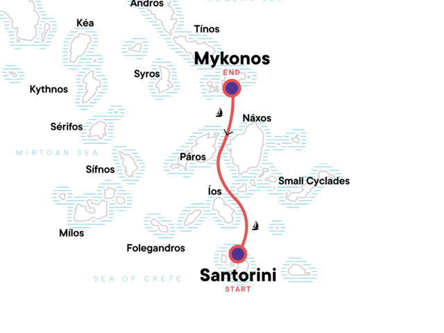 Possible island stops include: Folegandros, Sifnos, Ios, Antiparos, Paros, Naxos.