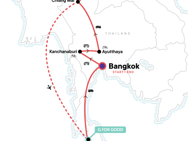 Cycle through busy Bangkok, experience colourful Chiang Mai, trek into remote hilltribe villages, discover ancient Ayutthaya by bike, learn about the sombre history of Kanchanaburi, kayak the Andaman Sea from Krabi