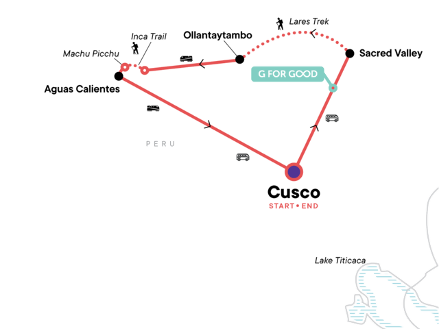 Your G for Good Moment: Handmade Biodegradable Soap Products. Sacred Valley guided tour. Pottery making demonstration. Guided Lares trek hike (3 days). Guided 1-day Inca Trail hike. Machu Picchu guided tour. All transport between destinations and to/from included activities.
