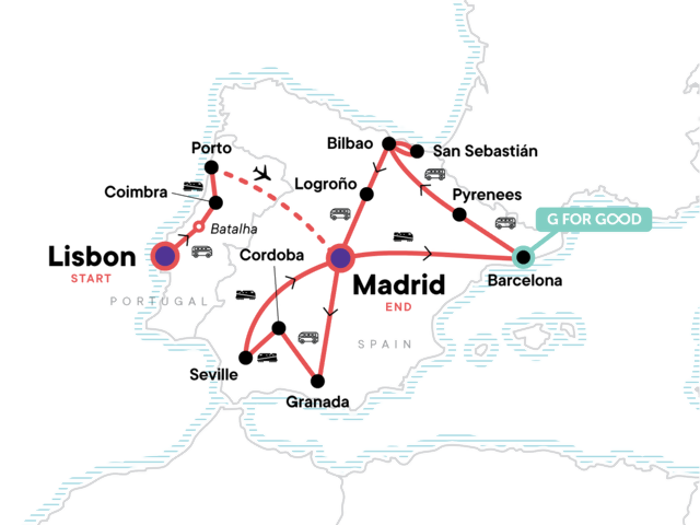 Your Foodie Moment: Rioja Region Wine Tasting, Logroño. Orientation walks in Lisbon, Porto, Madrid, Granada and Barcelona. Batalha gothic monastery entrance and visit. Albaicin quarter visit. Alhambra guided tour. Mezquita Mosque and Jewish quarter visit in Cordoba. Flamenco show performance. "Casa rural" stay with traditional meals (Pyrenees). San Sebastian day trip. Internal flight (Porto to Madrid). All transport between destinations and to/from included activities.