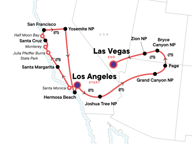 Your Welcome Moment: Welcome Moment - Meet Your CEO and Group. Stops in Santa Monica and San Luis Obispo. Visit to see the Elephant Seals. Hike in Julia Pfeiffer Burns State Park. San Francisco orientation tour. Yosemite National Park visit. Surf lesson in southern California. Visit to Joshua Tree National Park. Drive along Route 66. Hike in Grand Canyon National Park. Visit to Horseshoe Bend. Bryce Canyon National Park visit. Zion National Park visit. Entrance fees to all national parks and monuments with hiking and walking excursions. Self-inflating mattresses and dome tents. All transport between destinations and to/from included activities.